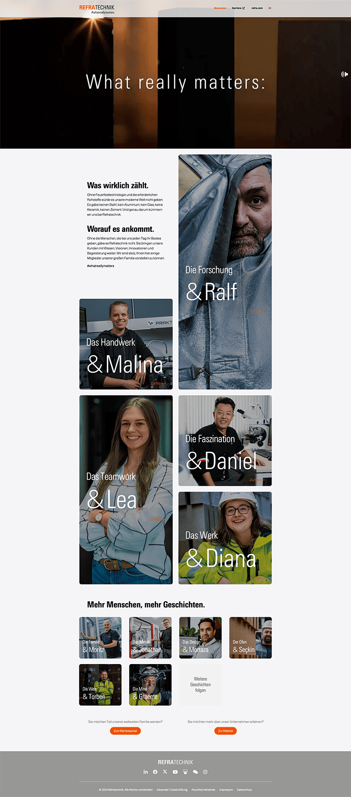 #whatreallymatters leitet die Zielgruppe mit Einzelmotiven über Social Media und Anzeigen auf eine zentrale Landingpage, auf der Testimonials aus der ganzen Welt das sympathische Gemeinschaftsgefühl der Refratechnik-Mitarbeitenden zu einem abwechslungsreichen Firmenportrait und einer attraktiven Arbeitgebermarke verdichten.