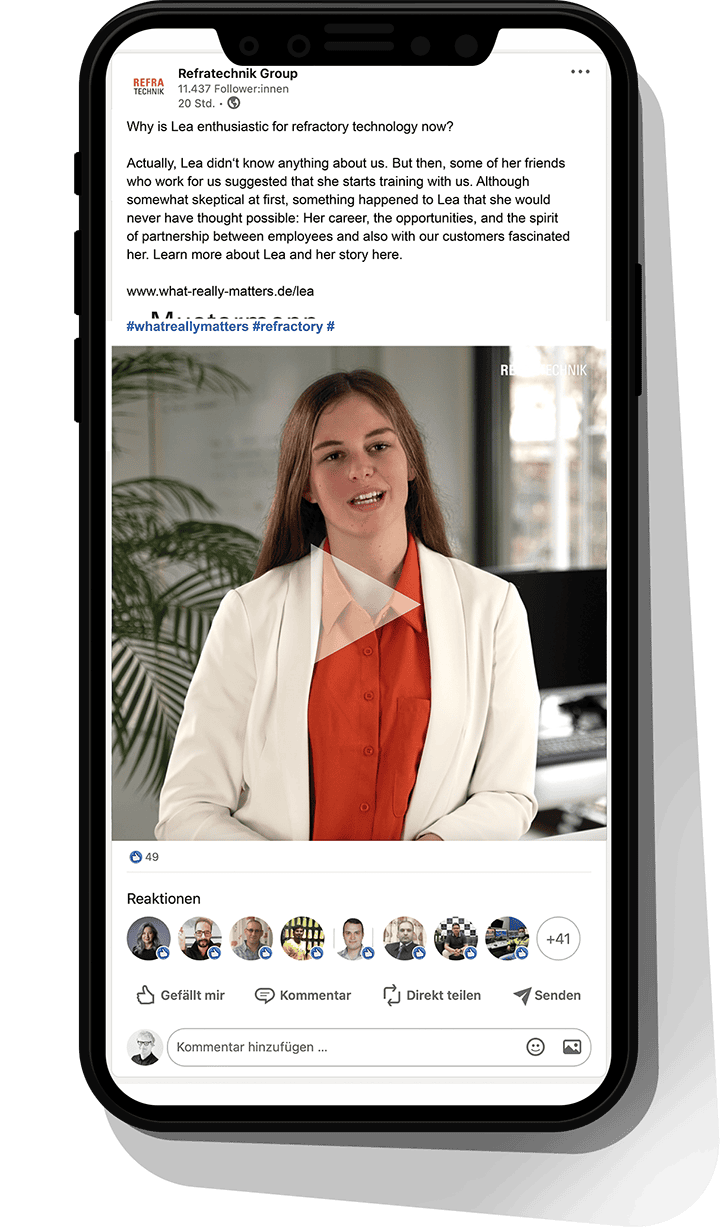 In Social Media und auf der Landingpage stellen die Mitarbeitenden stellen ihre Aufgaben, Herausforderungen, Ansichten, Wünsche und den Teamspirit authentisch in Videos dar. So werden das Unternehmen, die Marke und die Werte von Refratechnik unmittelbar und ehrlich erlebbar.
